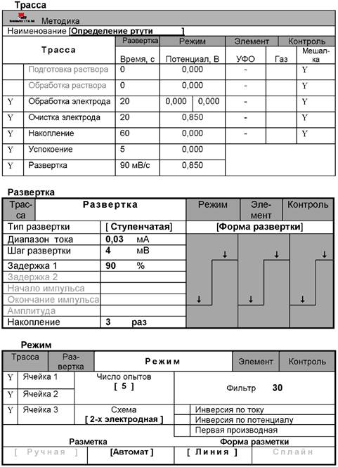 Метод ИВ измерений состоит из двух основных стадий: процесса электронакопления ртути на поверхности индикаторного электрода и процесса электрорастворения ртути. Процесс электронакопления проводят при определенном потенциале в течение заданного времени. Процесс электрорастворения ртути с поверхности электрода и регистрацию аналитического сигнала на вольтамперограмме выполняют при линейно меняющемся потенциале. Регистрируемая при электрорастворении вольтамперограмма содержит максимум. Потенциал максимума (тока пика) характеризует природу элемента, а величина максимального тока пропорциональна концентрации ртути.