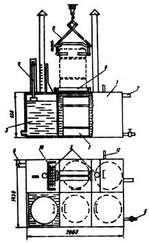 Бочки с БП-3 помещают в емкость с помощью подъемного механизма с захватом, имеющего дистанционное управление (11).