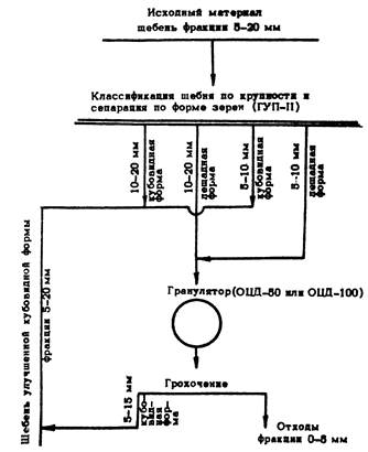29. На рис. 5 приведена рациональная схема технологии производства щебня улучшенной формы фракции 5 - 20 мм. Как видно из схемы, исходный материал - щебень из гравия крупностью Б-20 мм - поступает на виброгрохот ГУП-III на сита: верхнее - щелевидное, с шириной ячейки (щели) 7,5 мм; среднее - квадратное, со стороной квадрата 7,0 мм, диагональю 10,0 мм.