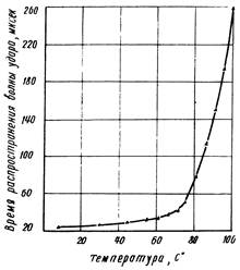 15. В целях контроля данных, полученных на образцах-эталонах, выбуривают керны (или каким-либо другим способом вырубки), которые затем подвергают испытаниям согласно ГОСТ 12801-71. По полученным результатам физико-механических испытаний строится корреляция (связь) между скоростью волны удара и стандартными показателями (объемный вес, прочность и др.), а также вычисляются переходные коэффициенты для выражения этой связи в аналитическом виде с поправками на температуру. Пример такой связи приведен на рис. 4 (данные относятся к температуре +20 °С).
