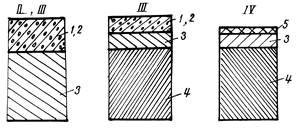 1 - асфальтобетон или битумоминеральные смеси; 2 - монолитный или сборный цементобетон; 3 - грунт, укрепленный зольно-битумным или полимерно-битумным вяжущим; 4 - грунт, укрепленный цементам или золами уноса; 5 - слой износа