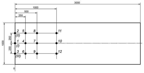 (I - III) - места измерения скорости потока воздуха; 1 - 12 - места расположения термопар на поверхности калибровочного образца, а также на поверхности образца покрытия Рисунок А.2 - Схема размещения термопар на поверхности калибровочного образца, а также на поверхности образца покрытия и места измерения скорости направленного потока воздуха |