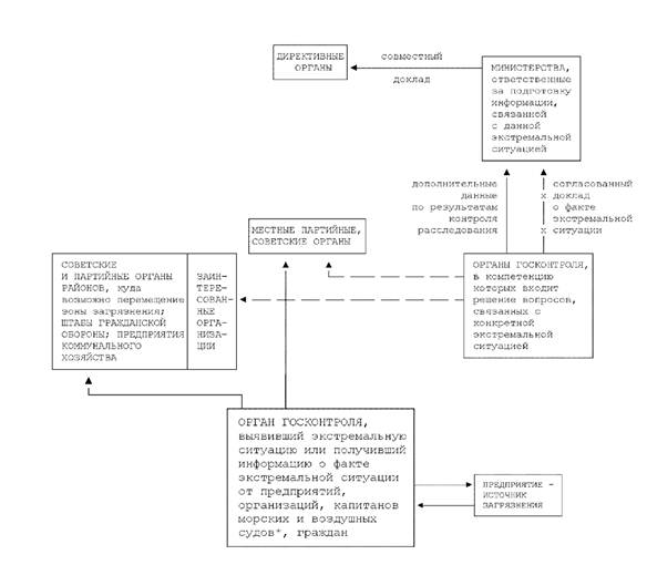 Инструкция устанавливает порядок действий органов, специально уполномоченных осуществлять государственный контроль за охраной природной среды, - Госкомгидромета, Минводхоза СССР, Минрыбхоза СССР, Минздрава СССР, Мингео СССР, Минсельхоза СССР, Администрации Северного морского пути при Минморфлоте, Гослесхоза СССР*(1) при обнаружении и расследовании аварий и других случаев, связанных с экстремально высоким загрязнением природной среды (атмосферного воздуха, почв, поверхностных, подземных, морских вод)*(2), с целью оперативного контроля за зоной загрязнения, снижения возможных отрицательных последствий, ликвидации причин экстремально высокого загрязнения, оперативного обеспечения союзных директивных органов согласованной информацией о создавшейся ситуации и принимаемых мерах.