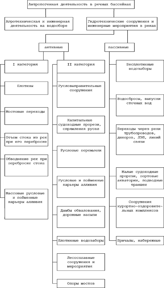 2. Активные сооружения и мероприятия могут быть подразделены на две категории. Строительство сооружений и осуществление мероприятий I категории приводит к однонаправленному необратимому изменению большинства характеристик определяющих факторов в масштабе всей реки. Эти изменения могут касаться любого числа определяющих факторов: одного, двух или трех. Поскольку закономерное сочетание определяющих факторов создает конкретный тип руслового процесса, их изменение может привести в первую очередь к смене типа макроформ, к возникновению новых значений характеристик потока и русла. Последнее приводит к изменению русловых образований на других структурных уровнях, то есть на уровнях мезоформ и микроформ. В силу больших размеров и капитальности этих сооружений и мероприятий указанные изменения русловых форм не оказывают на них заметного влияния.