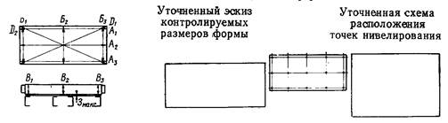 4.5. Первый этап периодического контроля связан с определением внутренних размеров собранной формы перед бетонированием. Изделие, забетонированное в этой форме, отмечается и замеряется после извлечения из формы. Замеры формы проводятся в соответствии с указаниями приложения III.