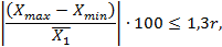Если условие (5) не выполнено, то получают ещё два результата измерений. За окончательный результат анализов принимают среднее арифметическое четырёх результатов измерений, если расхождение между максимальным (Xmax) и минимальным (Xmin) результатами параллельных измерений не превышает 1,3r.