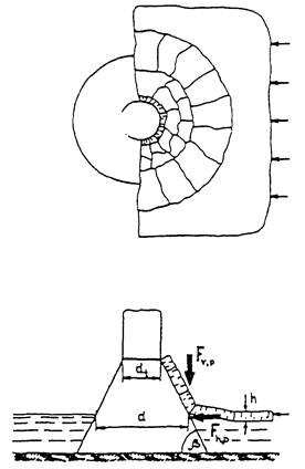 6.9. Точку приложения равнодействующей ледовой нагрузки, определенной согласно пп. 6.2 и 6.8, необходимо принимать ниже расчетного уровня воды на 0,25hc.