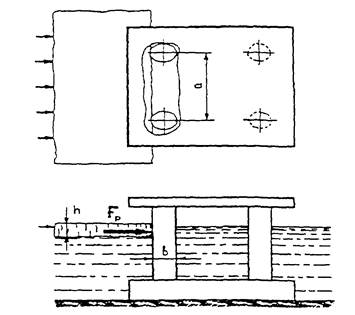 Для практических расчетов воздействие льда в период ледохода на вторую и последующие стойки опоры в ряду, расположенном параллельно направлению нагрузки (движения ледяных полей), можно не учитывать, поскольку первые элементы ряда работают как аванпостные сооружения, у которых происходит разрушение ледяных полей.