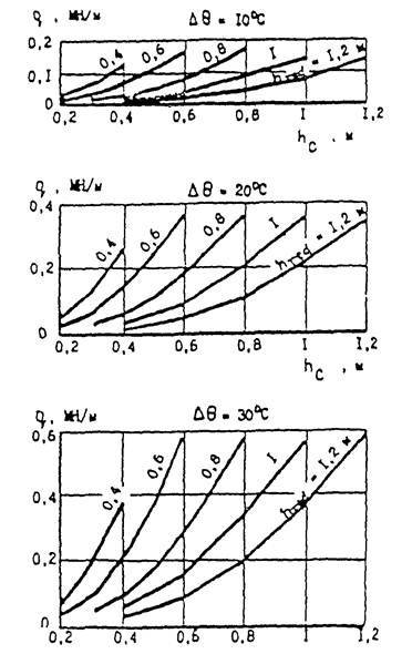Значения q определяются по графикам (рис. 3) при заданных значениях перепадов температуры воздуха Δθ, °С и соответствующих им реальных и приведенных толщинах льда hc, м и hred, м.