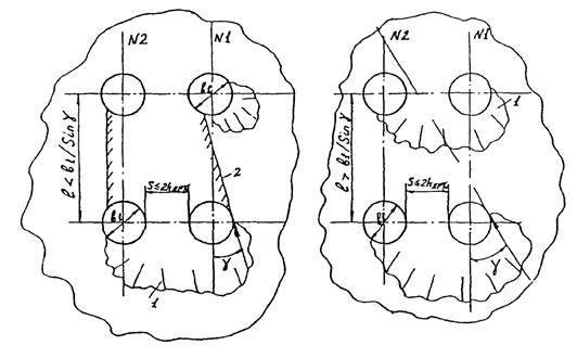 6.11. В многостоечных опорах (рис. 4) при косом направлении действия ледовой нагрузки на второй и последующие стойки ряда, расположенные вдоль движения ледяных полей, совместная работа стоек будет при соблюдении условий: