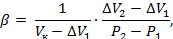 7.1.4.6. По полученным значениям Р1, Р2, ∆V1, ∆V2 проводят вычисление коэффициента сжимаемости нефти в пробоотборной камере прибора по формуле