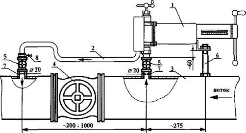 1 - прибор УОСГ - 100 СКП; 2 - подсоединительный шланг; 3 - трубопровод; 4 - задвижка (местное гидравлическое сопротивление); 5 - вентиль Dy 20 (R %»); 6 - болт М 16; 7 - входной и выходной штуцера; 8 - сливной клапан.