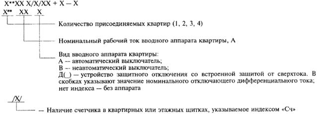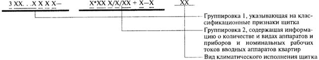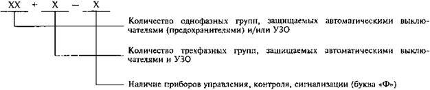 Пример обозначения типа этажного учетно-распределительно-группового щитка, встраиваемого в нишу класса I, на четыре квартиры, с вводными выключателями на номинальный рабочий ток 31,5 А, со счетчиками, с четырьмя однофазными группами, климатического исполнения УХЛ4: