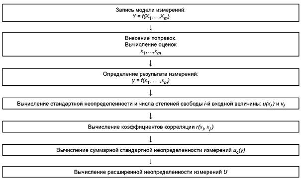 В.1 При вычислении неопределенности измерений следует придерживаться последовательности, показанной на рисунке 1 [подробнее см. рекомендации [7] (подпункт 5.1.1)].