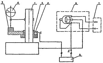 1. Стойка С-III ГОСТ 10197-70; 2. Плита поворотная; 3. Плитка мерная h = 10 мм; 4. Прибор быстродействующий самопишущий Н338.ТУ 25-04-2368-75; 5. Втулка электроизоляционная; 6. Индикатор ИЧ 10МД; 7. Источник питания (U = 1,5 - 5 В); 8. Переменное сопротивление (R = 470 Ом)