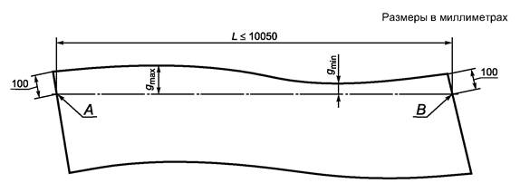 9.3.1 Для измерения прямолинейности полотна материала длиной L £ 10,05 м на противоположных его концах отмечают две точки на базовом расстоянии 100 мм от одной из продольных кромок полотна (см. рисунок 1, точки А и В). С помощью натянутого меленого шнура на поверхность полотна материала наносят контрольную прямую линию, соединяющую эти точки.