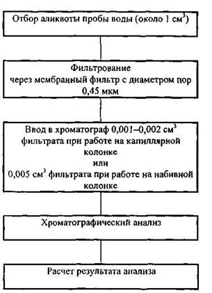 Около 1 см3 пробы воды с помощью шприца однократного применения фильтруют через мембранный фильтр, вводят в испаритель хроматографа необходимый объем пробы и хроматографируют в условиях построения градуировочной характеристики (п. 8.1). Анализ пробы повторяют.