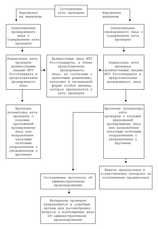 10. Результатом исполнения государственной функции является оформление акта проверки. В случае выявления нарушений обязательных требований государственных стандартов и технических регламентов по завершении оформления акта проверки принимаются следующие меры: