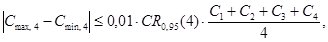 критического диапазона (допускаемое расхождение между наибольшим и наименьшим из четырех результатов измерений, полученных в одной лаборатории в условиях повторяемости), CR0,95(4), % |