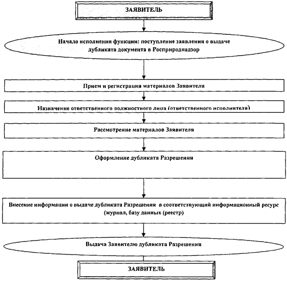 Описание последовательности и состава действий Росприроднадзора при реализации административной процедуры по выдаче дубликата Разрешения указаны в блок-схеме в Приложении № 3 к Регламенту.