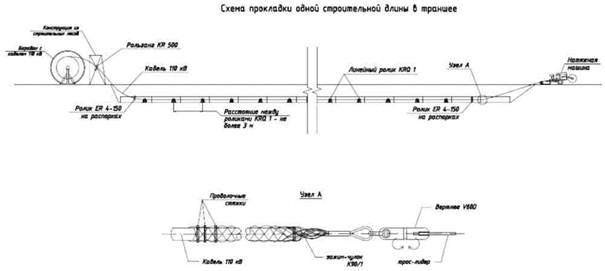 г) на тросах прокладки кабелей, имеющих повороты, запрещается размещаться внутри углового поворота кабеля, поддерживать кабель на углах поворота, а также оттягивать его вручную. На прямолинейных участках трассы электромонтажникам следует находится по одной стороне кабеля;