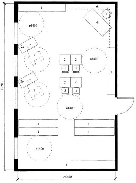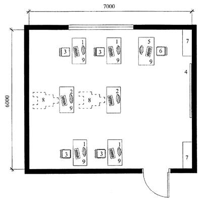 5 - стол преподавателя; 6- стул преподавателя; 7 - шкаф-стеллаж