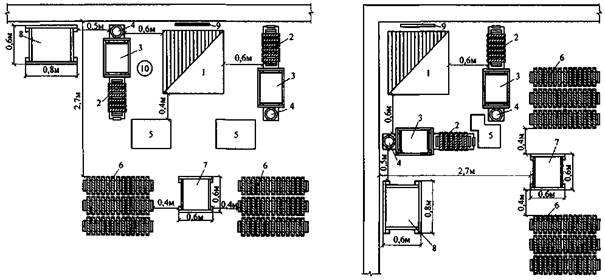 2.2.4. К выполнению работ по кладке и ремонту печей, каминов и дымовых каналов необходимо приступать после заготовки и рационального размещения кирпича, раствора, инвентаря, печных приборов, а также разделения труда с учетом квалификации рабочих. Схемы организации рабочего места при кладке печи в разных местах помещений показаны на рис. 2.1 и рис. 2.2.