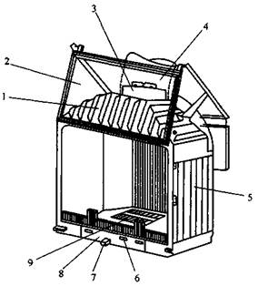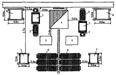 1 - печь; 2 - рамка с кирпичом; 3 - ящик с глиной; 4 - ведро; 5 - кирпич ломаный, кирпич огнеупорный, изразцы; 6 - запас кирпича; 7 - емкость с водой для замачивания кирпича; 8 - ящик с раствором; 9 - рамка с чертежом.
