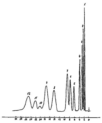 1 - метан; 2 - этан; 3 - этен; 4 - пропан; 5 - протон; 6 - изо-бутан; 7 - бутан; 8 - изо-бутен; 9 - бутен; 10 - бутен-2; 11 - изо-пентан; 12 - пентан.