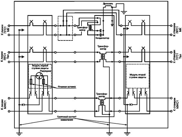 защитные устройства (станционного) оборудования железнодорожной электросвязи: Технические средства, предназначенные для защиты станционного оборудования железнодорожной электросвязи от помех и повреждения электрическим током, возникающих в проводных линиях связи в результате магнитного и гальванического влияния. [ГОСТ Р 53953-2010, статья 195] |