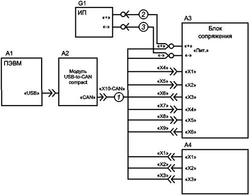А1 - ПЭВМ; А2 - модуль USB-to-CAN; A3 - блок сопряжения; А4 -