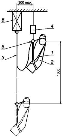 Подвешивают манекен корпуса посредством спасательной привязи, затем поднимают манекен на высоту 1000+50 мм с удалением от осевой линии оборудования не более 300 мм (см. рисунок 4). Удерживают его с помощью устройства быстрого расцепления.