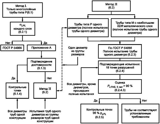 На рисунке В.1 приведена схема определения длительной прочности конструкции многослойной трубы в соответствии с требованиями настоящего стандарта по методу I и методу II.