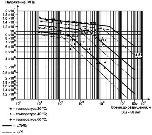 - оценить нижний прогнозируемый предел напряжения (на уровне 97,5 %-ной вероятности) при разных сроках службы трубы или при разных температурах, или, в некоторых случаях, при указанных условиях одновременно.