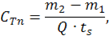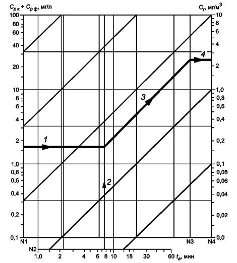 a) сумма значений Срк и Срф отложена по вертикальной шкале N1 и от полученной точки проводится горизонталь 1 до встречи с перпендикуляром 2, созданным из соответствующей точки горизонтальной шкалы N2, на которой отложены времена ta - продолжительность отбора пробы;
