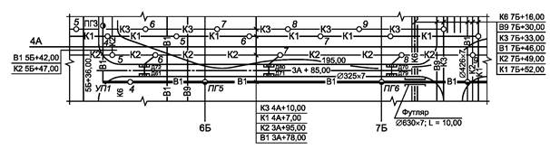 - футляры на трубопроводах с указанием диаметров, длин и привязок их коси дорог или проектируемым сетям и сооружениям.