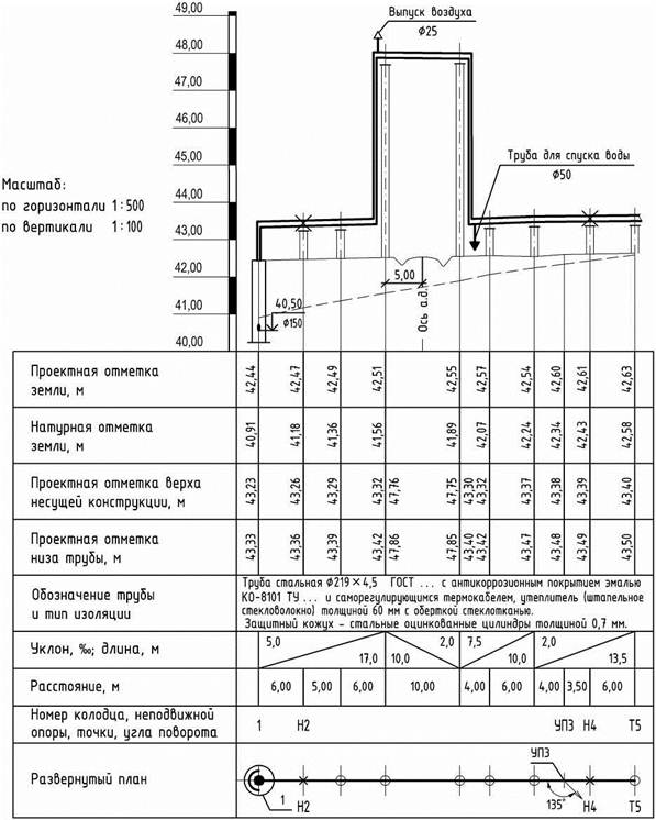 Допускается дополнять таблицу другими данными (например, пикеты, развернутый план трассы, схема сети, высота опор), характеристикой грунтов в основании трубопровода (например, просадочность, набухание, коррозионность), а также приводить шкалу отметок.
