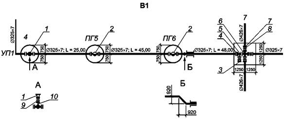 - секущие плоскости поперечных разрезов и их нумерацию (обозначения) - для трубопроводов надземной прокладки;