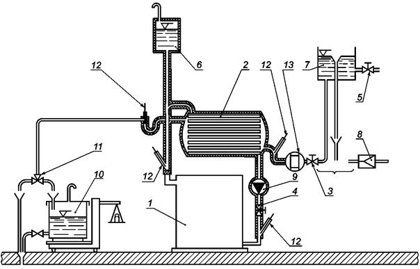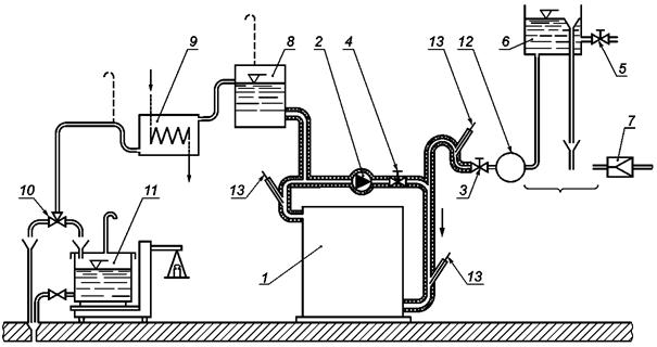 11 - сосуд для взвешивания; 12 - водяной расходомер; 13 -
