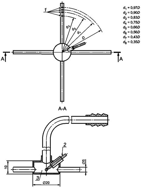 1 - отверстия в каждом ответвлении: 8´Æ 1 мм; 2 - термопара; 3 - пробоотборник