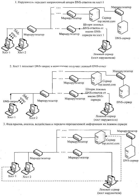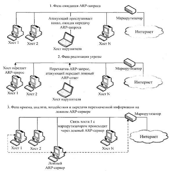 При этом могут быть угрозы, аналогичные тем, которые имеют место в отдельном АРМ, не подключенном к сетям общего пользования, а также угрозы, реализуемые внутри распределенной сети с использованием протоколов межсетевого взаимодействия, в том числе: