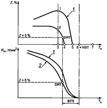 После испытания местное сужение (Z) в зоне разрушения вычисляют как долю от первоначального сечения образца для испытания. Предел прочности на растяжение (Rm) может быть получен делением наибольшего усилия на исходную площадь поперечного сечения образца. Эта характеристика и местное сужение поперечного сечения должны быть представлены для испытаний при нагреве и охлаждении в виде функций от температуры испытания. Типичные графики приведены на рисунке 2.