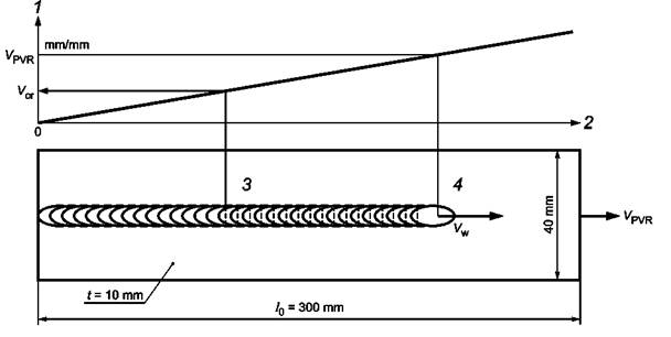 Процедура испытания в стандартной форме показана на рисунке 6. Сварка (с применением постоянной скорости) выполняется в сочетании с линейно возрастающей скоростью растяжения VPVR, начинающейся с нуля и достигающей 70 мм/мин по завершении процедуры испытания. Хотя испытание в стандартной форме выполняется при совпадении направлений сварки и растягивающей нагрузки, можно также оценивать сварные швы, перпендикулярные направлению ее действия.