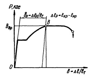 Примечание. Определение δр производится на участке диаграммы растяжения, заканчивающемся точкой В, которая соответствует началу достижения максимальной нагрузки Рвр.
