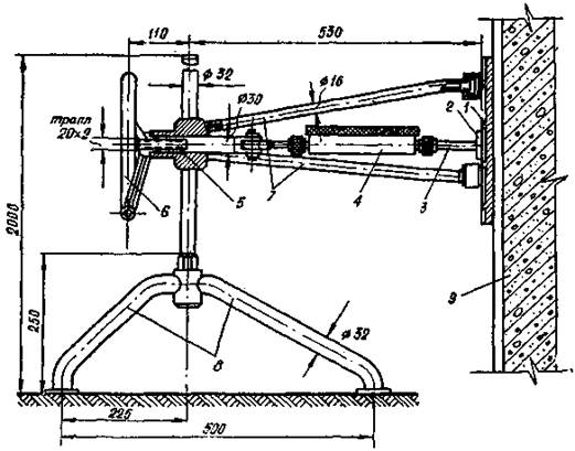 1 - стеклянная плитка; 2 - стальная пластинка: 3 - стержень; 4 - динамометр; 5 - винт; 6 - маховое колесо; 7 - тренога; 8 - опора; 9 - стеновая панель