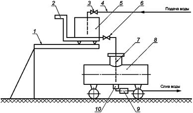 наливной кран; 4 - шланг; 5 - ТМ; 6 - гидросистема слива;