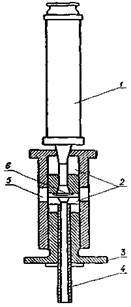 1 - всасывающее устройство (медицинский шприц вместимостью 10 - 20 см3); 2 - прокладка (из тефлона); 3 - винт для прижима индикаторной бумаги; 4 - заборная трубка; 5 - окно (прорезь), в которое вкладывается индикаторная бумага; 6 - реакционная зона (диаметр 6 - 7 мм) (устройство изготовлено из титана)