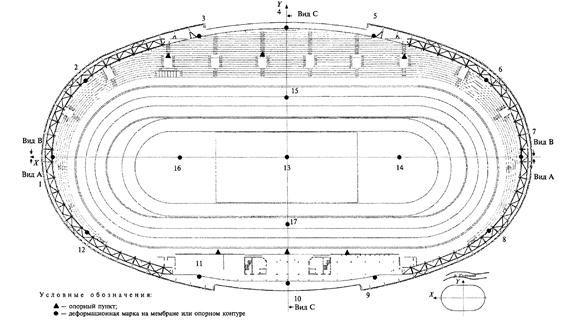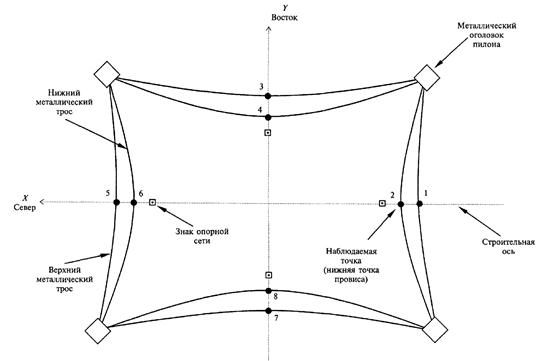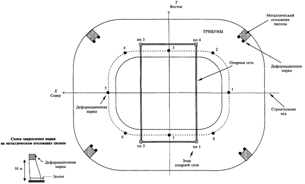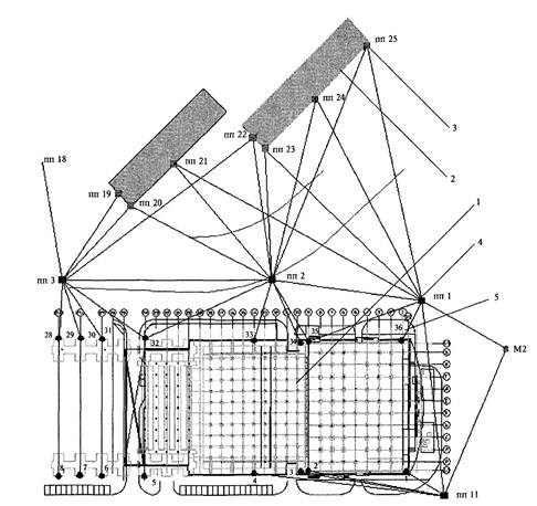 1.2.7. Для измерения горизонтальных перемещений и кренов на объекте наблюдений проектируют и закладывают плановую деформационную сеть, опорную сеть и вспомогательные пункты.