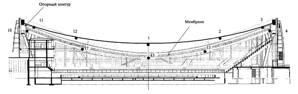 Большепролетные здания или сооружения - здания или сооружения с конструкциями покрытия пролетом свыше 36 м без промежуточных опор. К ним относятся пространственные конструкции - сплошные и стержневые оболочки, купола, висячие вантовые, тонколистовые (мембранные) и тентовые покрытия, стержневые пространственные конструкции (структуры), перекрестные системы, а также традиционные конструкции больших пролетов - фермы, рамы, арки и т.п.
