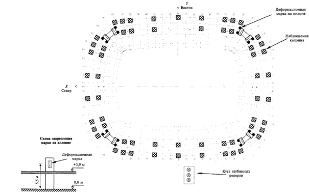 Расположение деформационных марок на объекте согласуется с проектировщиком.